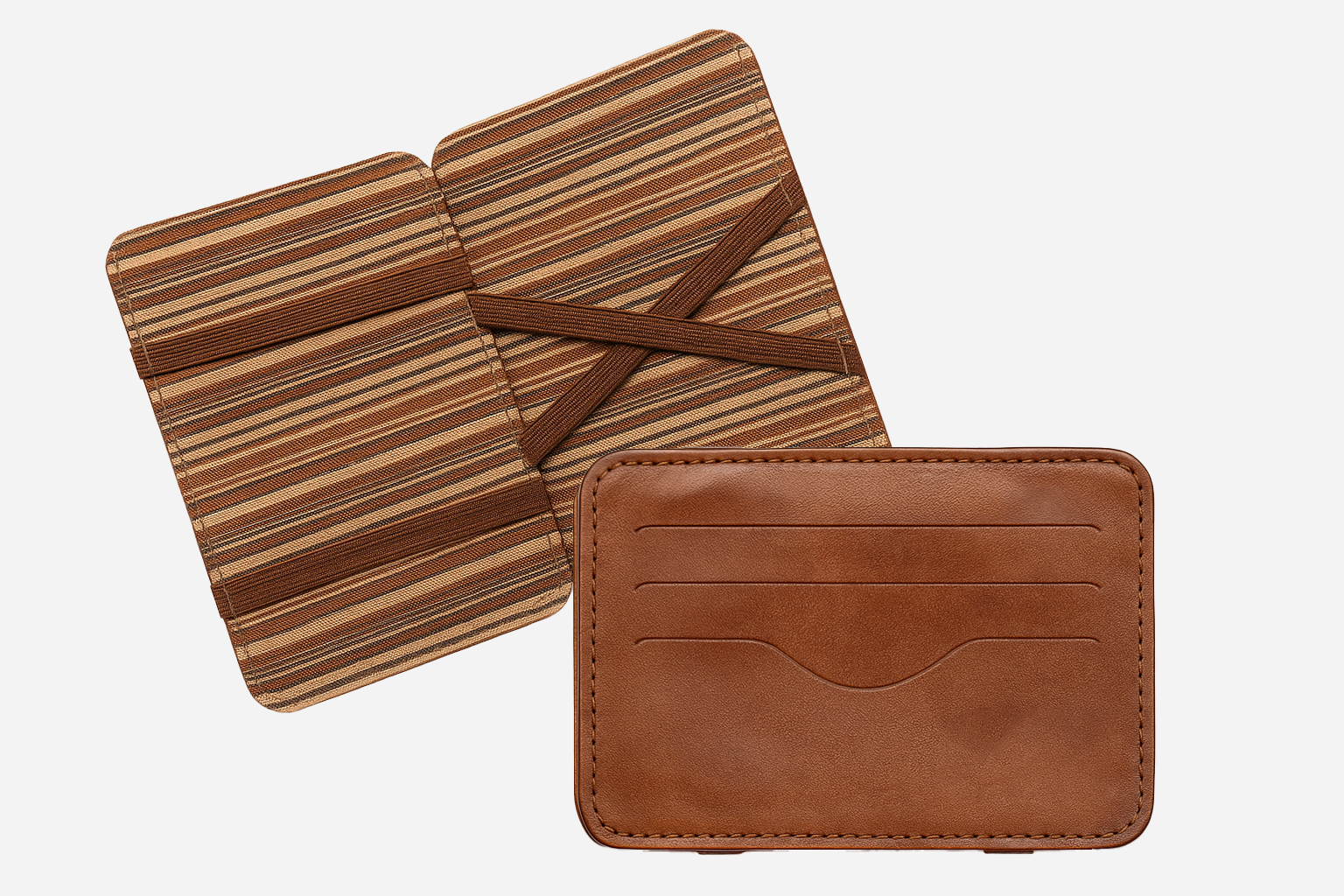 Carteira mágica masculina em couro legítimo na cor caramelo. Conta com três divisórias para cartões e espaço interno com elásticos para cédulas dobradas e CNH.